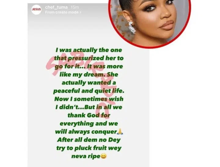 “I was actually the one that pressurized her to go for it….It was more like my dream. She actually wanted a peaceful and quiet life. Now I sometimes wish I didn’t…. But in all we thank God for everything and we will always conquer. After all dem no dey try to pluck fruit wey never ripe,” she wrote in an Instagram story.