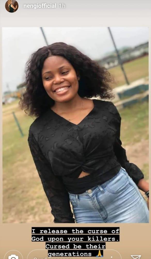 Big Brother Naija star, Nengi sympathizes with the unfortunate death of Iniobong Umoren as she unleashes mayhem and curses upon her killers.