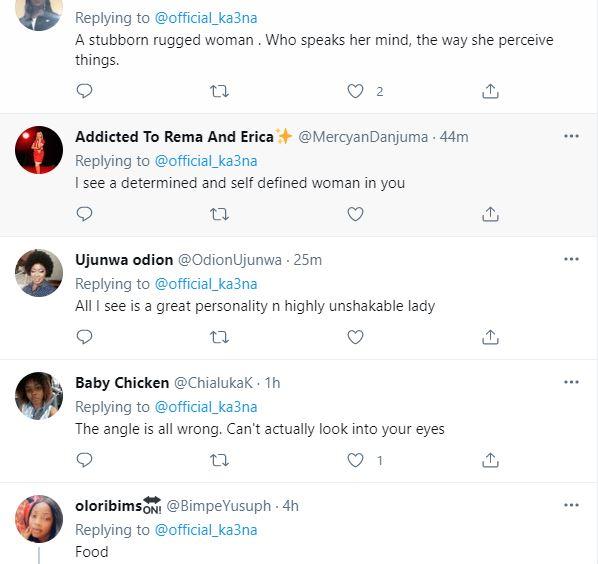 Popular brand influencer, Ka3na Jones, a.k.a bosslady trigger mixed reactions after quizzing her fans on what they see in her eyes.