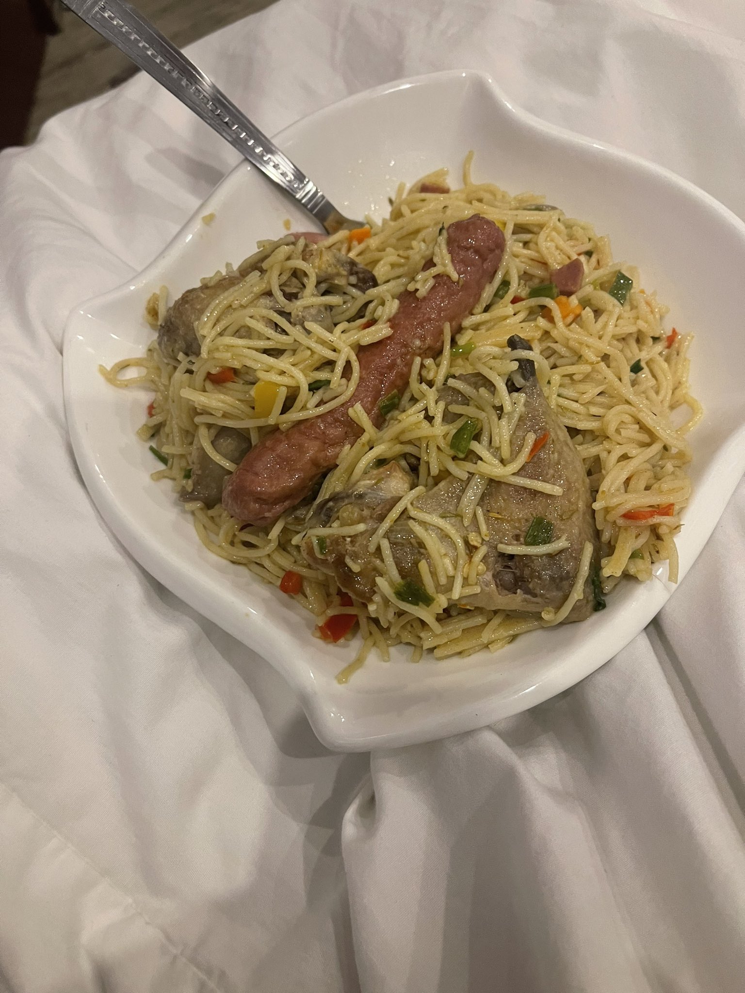 To her utter disappointment, the boyfriend has prepared spaghetti and had cut them to small for her taste.