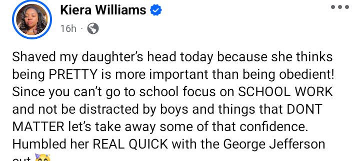 According to the mother, the haircut, jokingly referred to as the “George Jefferson cut,” was intended to humble her daughter and refocus her attention on priorities.