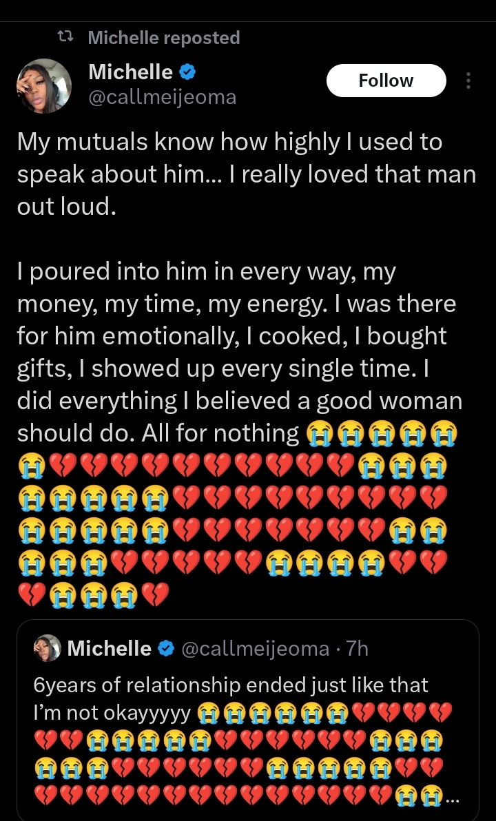 The lady, identified as @callmeijeoma on X (formerly Twitter), expressed sorrow over the end of her relationship.