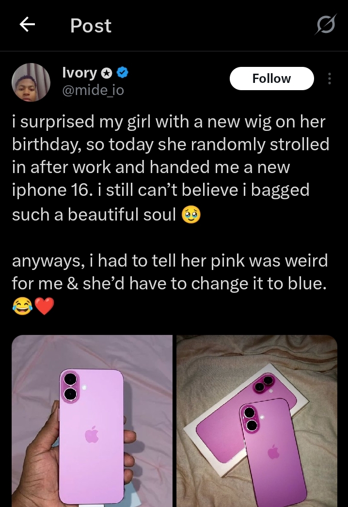 ”i surprised my girl with a new wig on her birthday, so today she randomly strolled in after work and handed me a new iphone 16. i still can’t believe i bagged such a beautiful soul. Anyways, i had to tell her pink was weird for me & she’d have to change it to blue. 😂” His tweet reads.