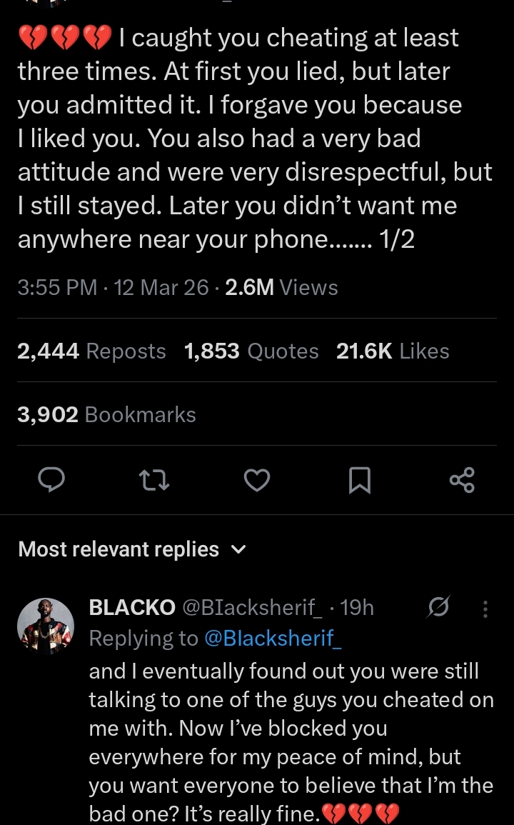 Sharing the aftermath of the heartbreaking discovery, @blacko narrated, “Now I’ve blocked you everywhere for my peace of mind, but you want everyone to believe that I’m the bad one? It’s really fine💔”.