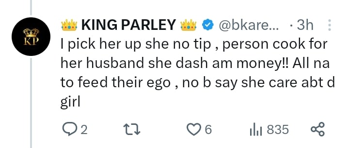I pick her up she no tip , person cook for her husband she dash am money!! All na to feed their ego , no b say she care abt d girl”
