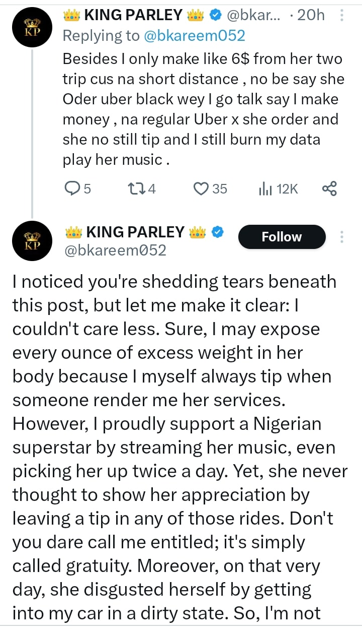I noticed you’re shedding tears beneath this post, but let me make it clear: I couldn’t care less. Sure, I may expose every ounce of excess weight in her body because I myself always tip when someone render me her services. However, I proudly support a Nigerian superstar by streaming her music, even picking her up twice a day. Yet, she never thought to show her appreciation by leaving a tip in any of those rides. Don’t you dare call me entitled; it’s simply called gratuity. Moreover, on that very day, she disgusted herself by getting into my car in a dirty state. So, I’m not surprised she didn’t tip. In the end, not everything that shines is truly precious.