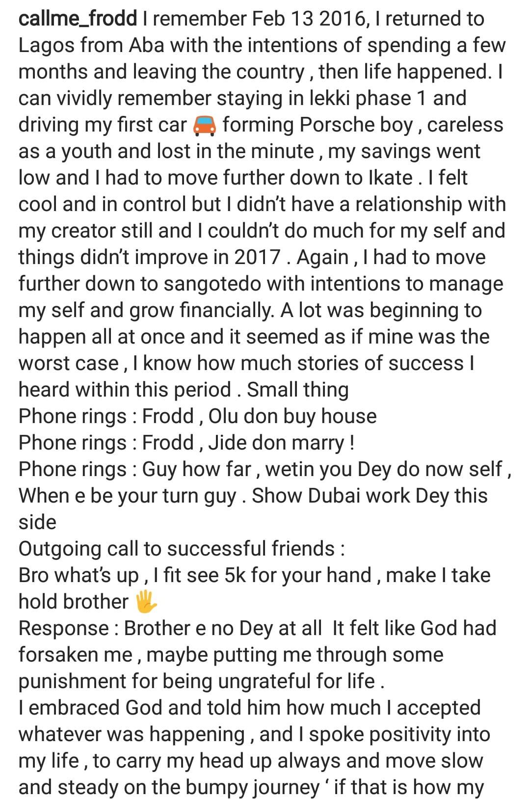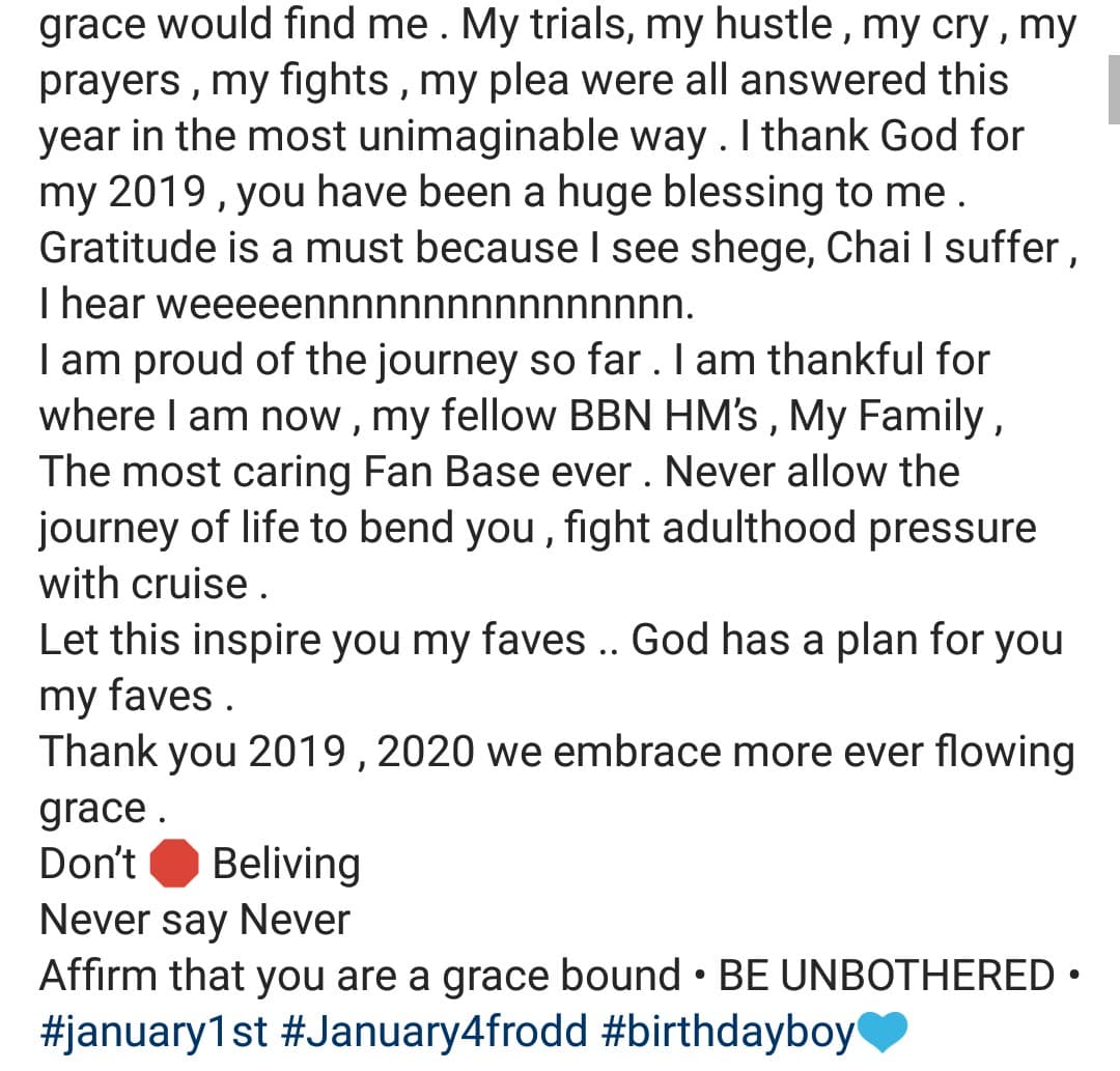I suffered in life but all my prayers were answered in 2019- Reality star, Frodd writes