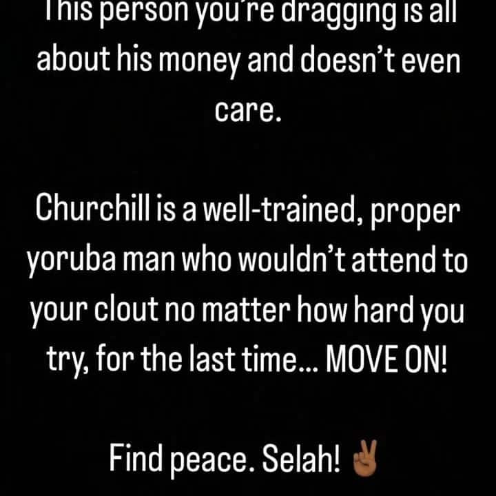 His sister, Gbemisola has now fired back and has asked her to move on. she also noted that “Churchill might just be the biggest thing to ever happen to Tonto”