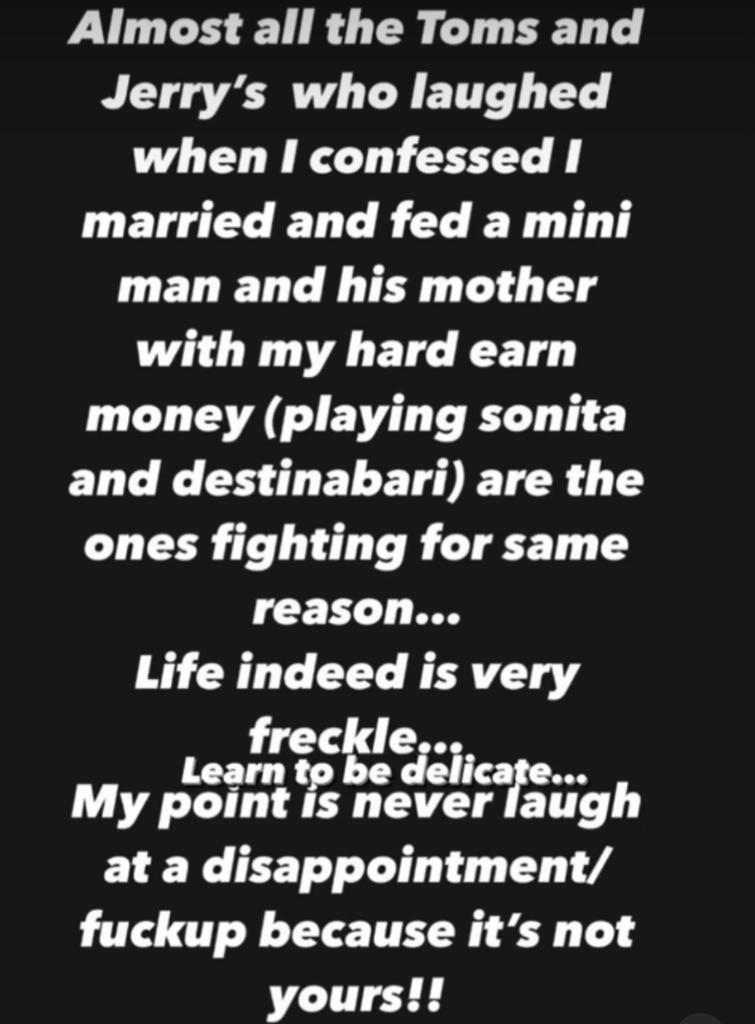 “Almost all the Toms and Jerry’s who laughed when I confessed I married and fed a mini man and his mother with my hard earn money (playing sonita and destinabari) are the ones fighting for same reason… Life indeed is very freckle… Learn tp be delicate… Ia My point is never ugh at a disappointment/ fuckup because it’s not yours!!”