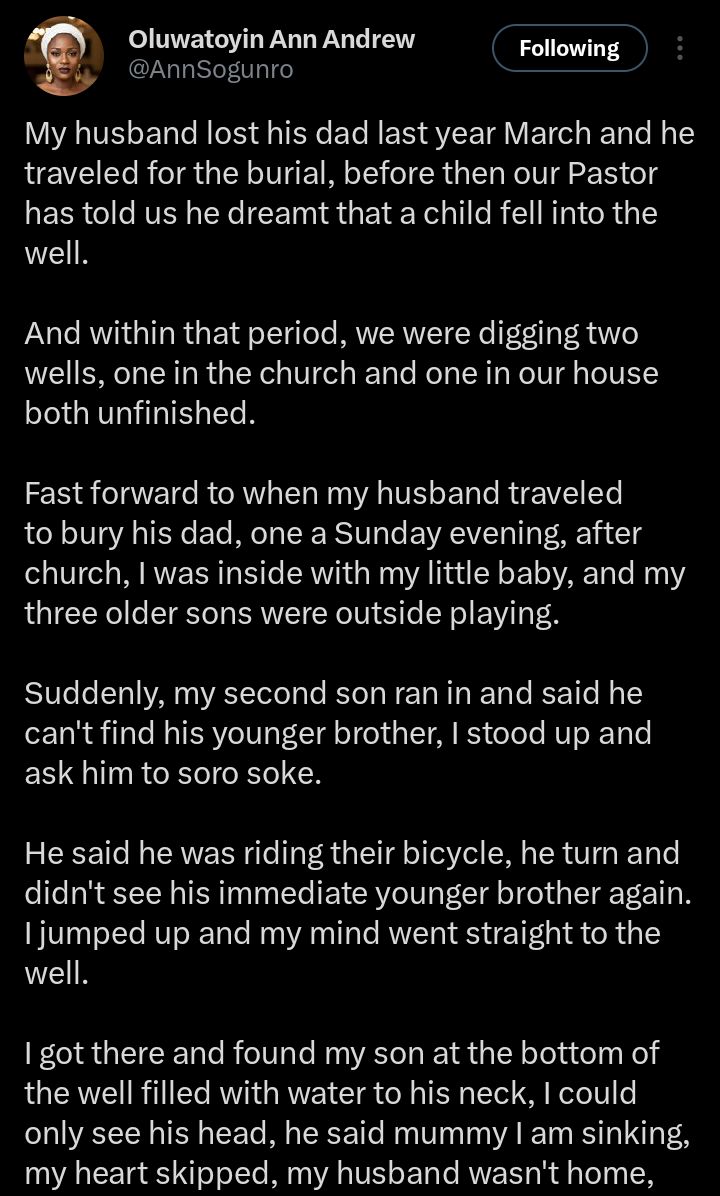 A mother has recounted a harrowing near-tragedy in her home after her youngest son fell into a well, narrowly escaping death.