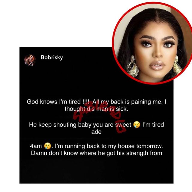 “God knows I’m tired !!!! All my back is paining me. I thought dis man is sick. He keep shouting baby you are sweet I’m tired ade 4am. I’m running back to my house tomorrow. Damn don’t know where he got his strength from”