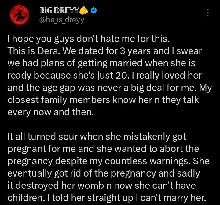 A young man has opened up about the end of his three-year relationship with a woman named Dera, revealing how an unexpected pregnancy changed everything.