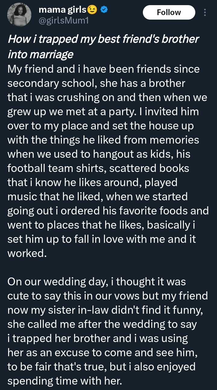 The woman shared her story online, explaining how a long-standing crush on her best friend’s brother eventually led to marriage, but also created tension after the wedding.