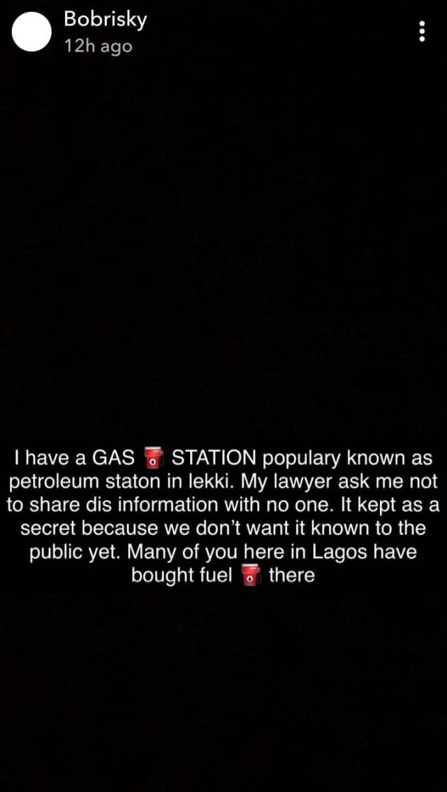 Taking to Snapchat, the controversial socialite revealed that he has a famous petroleum station sited at the heart of the State, Lekki but chose not to disclose it for long due to his lawyer’s advice.