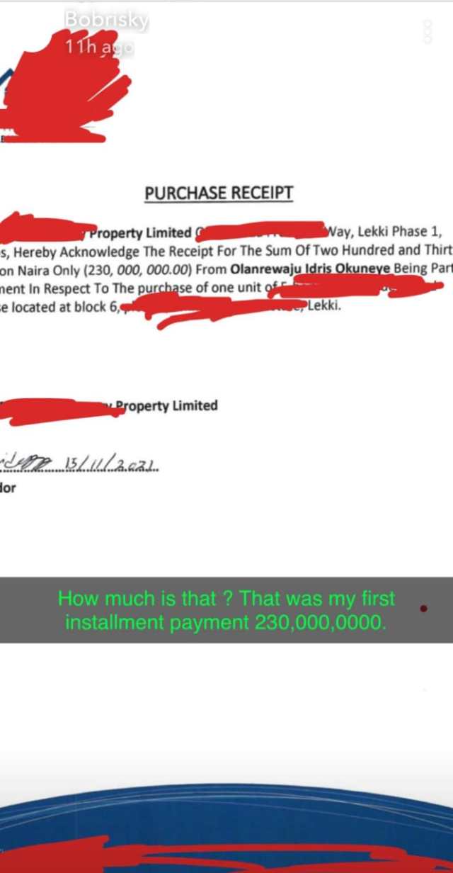“There is this hotel they want to sell in Lekki phase 1 for eight hundred million, when I told the guy I want to buy it, the guy was shocked. I told them I want to spread the payment for three month d guy didn’t believe until I make first payment on the 11th.”