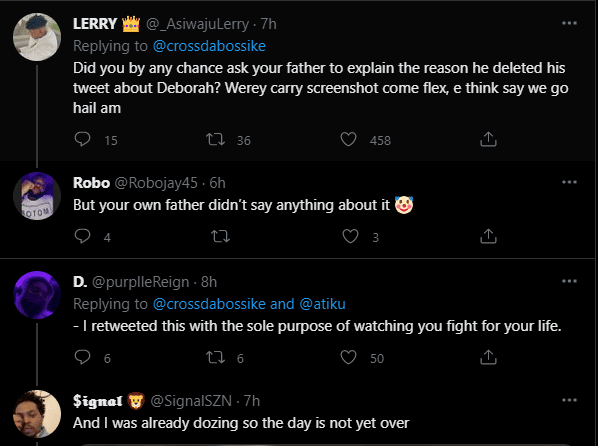 “Did you by any chance ask your father to explain the reason he deleted his tweet about Deborah? Werey carry screenshot come flex, e think say we go hail am,” a user wrote.
