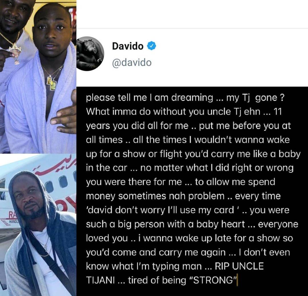 “Please tell me I am dreaming, my TJ gone? What imma do without you Uncle TJ ehn… 11 years you did all for me. Put me before you at all times. All the times I wouldn’t wanna wake up for a show or flight you’d carry me like a baby in the car…