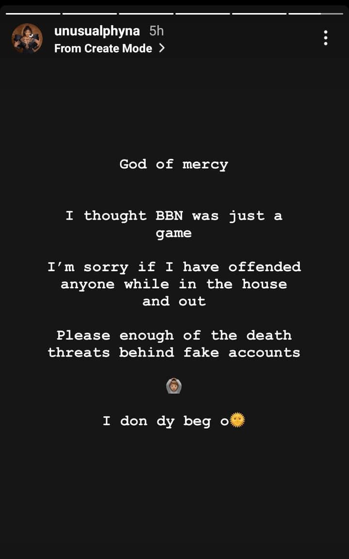 Phyna who had had enough with the whole threats took to her Twitter page to tender a general apology while pleading for her old life back.