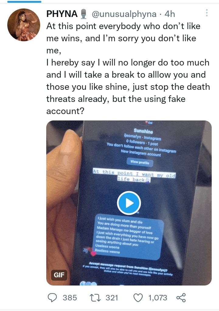 “At this point everybody who don’t like me wins, and I’m sorry you don’t like me. I hereby say I will no longer do too much and I will take a break to allow you and those you like shine, just stop the death threats already, but the using fake account?