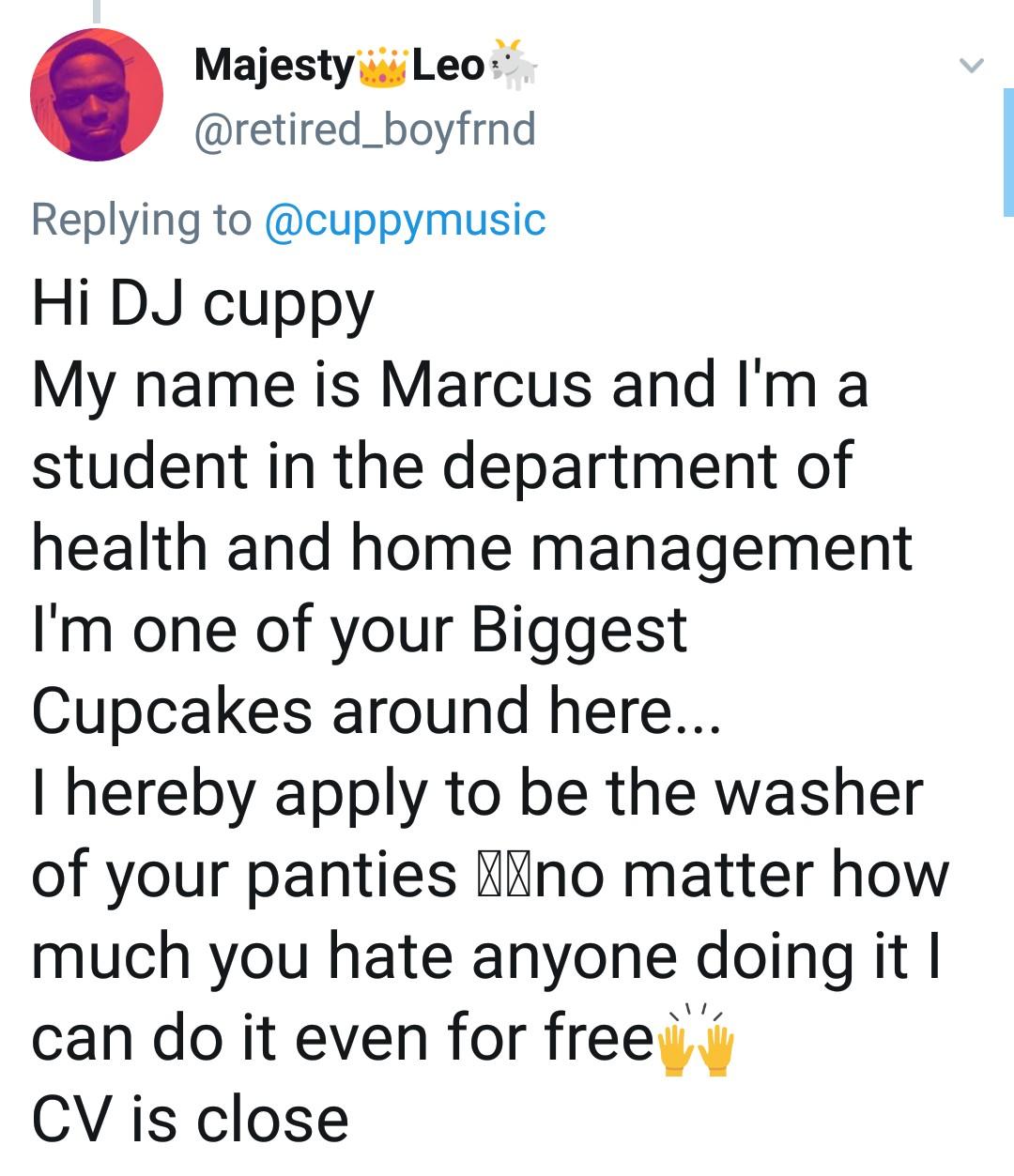 “Hi DJ cuppy. My name is Marcus and I’m a student in the department of health and home management. I’m one of your Biggest Cupcakes around here…I hereby apply to be the washer of your panties. no matter how much you hate anyone doing it I can do it even for free”.