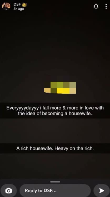 According to her, with each passing day, she keeps falling in love with the idea of becoming a wealthy housewife to a man.
