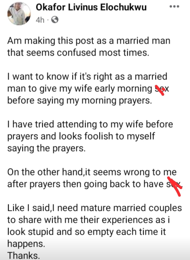 “I’m making this post as a married man that seems confused most times.I want to know if it’s right as a married man to give my wife early morning sxx before saying my morning prayers