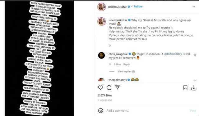 In her words: “Those asking why my name is Uriel music star is because I wanted to be the next Tiwa savage back then.