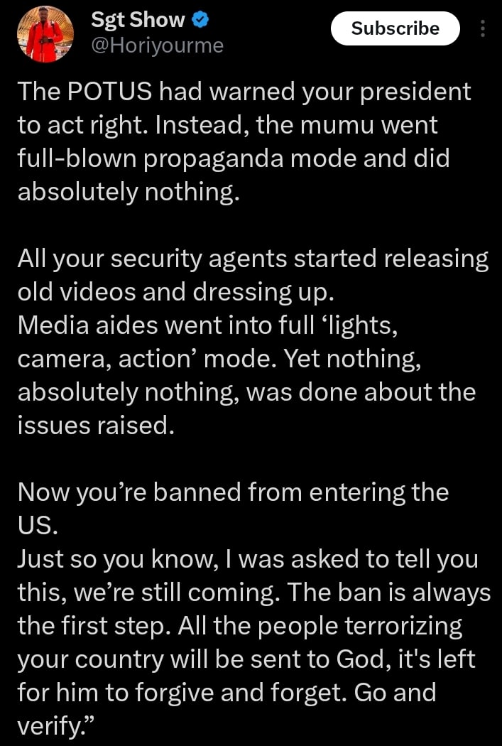 The soilder identifed with the X handle, @Horiyoume claimed that President Bola Ahmed Tinubu responded to Donald Trump’s warning about Christian genocide with propaganda rather than adequate action.