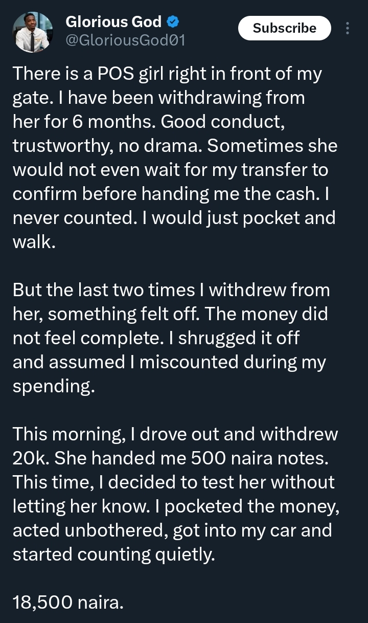 The man, who shared his story on social media, described how a POS agent he had trusted for over six months allegedly shortchanged him during recent transactions.