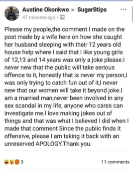 Recall we reported that the Nigerian man revealed his love for underaged girls while commenting on a Facebook post in which a woman who allegedly caught her husband sleeping with her 12-year-old niece sought for advice.