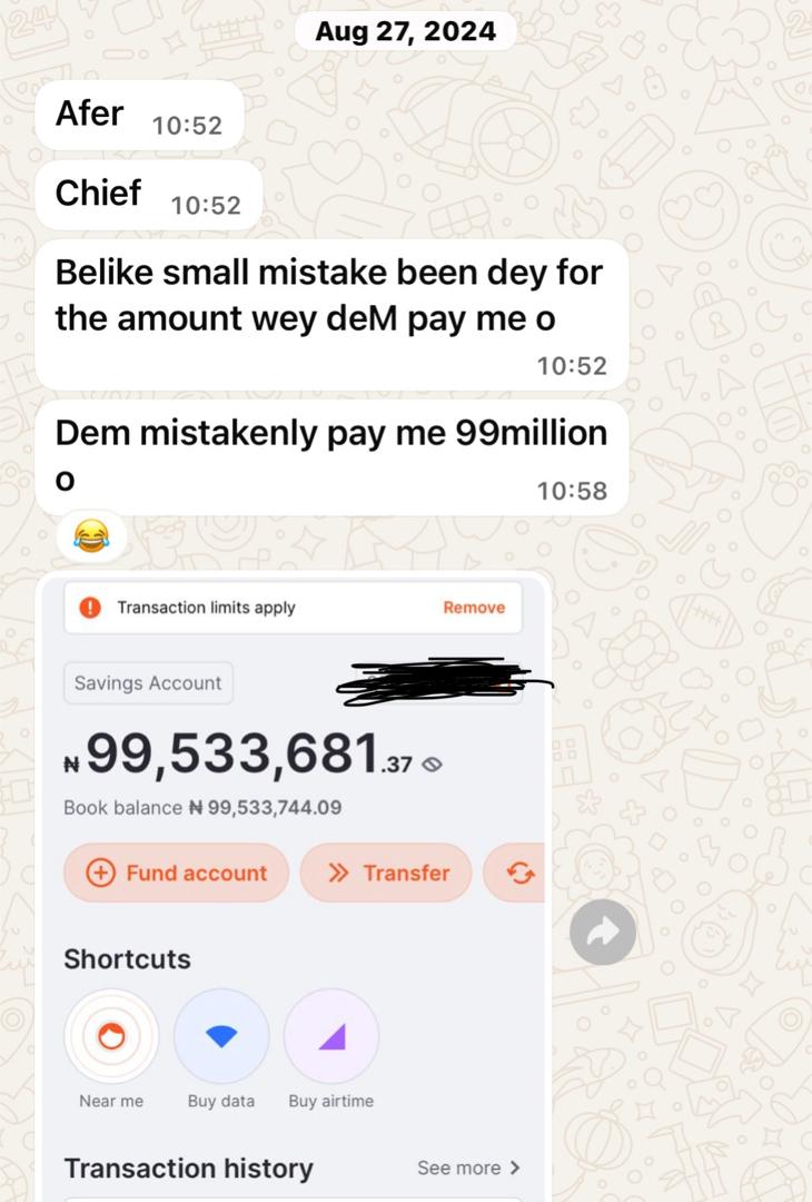 In 2024, a colleague of mine was mistakenly paid 99 million naira by the previous state government as salary arrears as seen in the screenshot, he reached out to me and I told him to return the money.