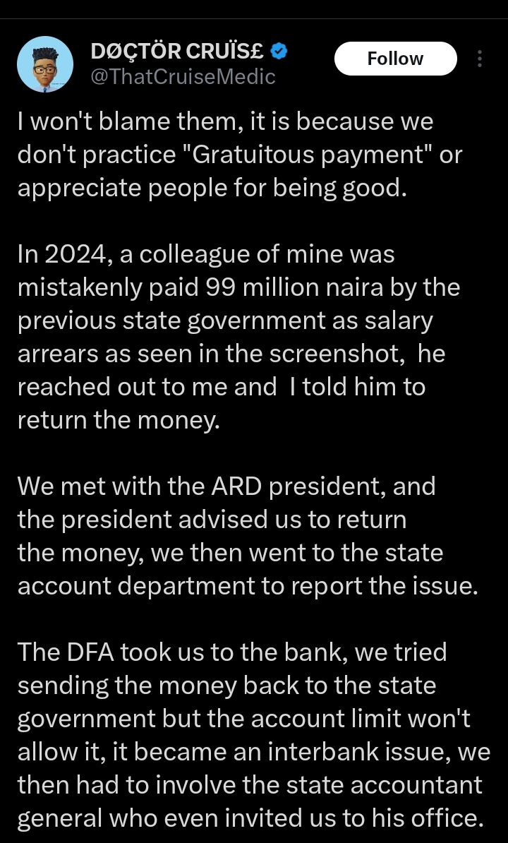 A medical doctor has shared how his colleague refunded ₦99 million mistakenly credited to his account as salary arrears.
