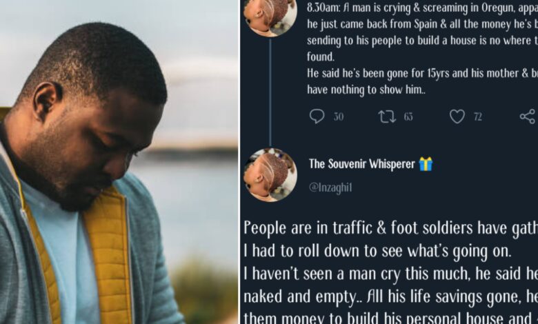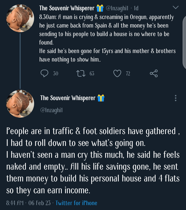 “8.30am: A man is crying & screaming in Oregun, apparently he just came back from Spain & all the money he’s been sending to his people to build a house is no where to be found. He said he’s been gone for 15yrs and his mother & brothers have nothing to show him..