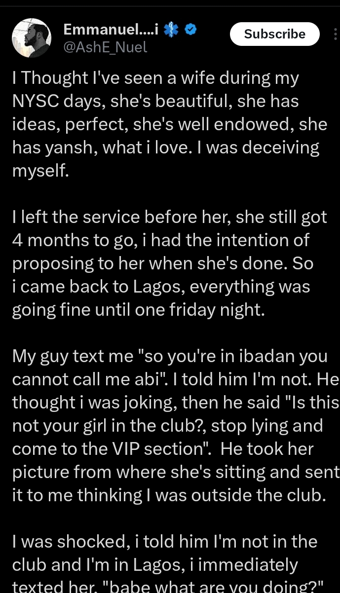 An X user shared a heartbreaking account of why his relationship with a female National Youth Service Corps (NYSC) member ended.