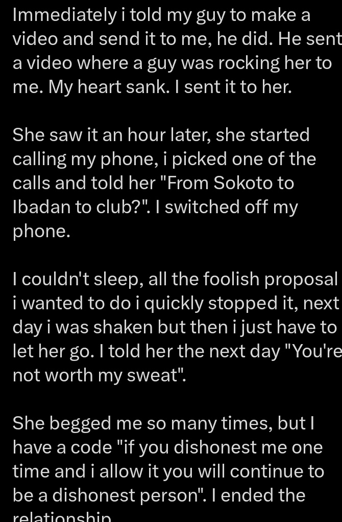 Sharing how he handled the heartbreaking incident, he stated, ‘She saw it an hour later and started calling my phone. I picked up and said, “From Sokoto to Ibadan to a club?” I switched off my phone. I couldn’t sleep, all the foolish proposals I wanted to make, I quickly scrapped. The next day, I was shaken, but I had to let her go. I told her, “You’re not worth my sweat”