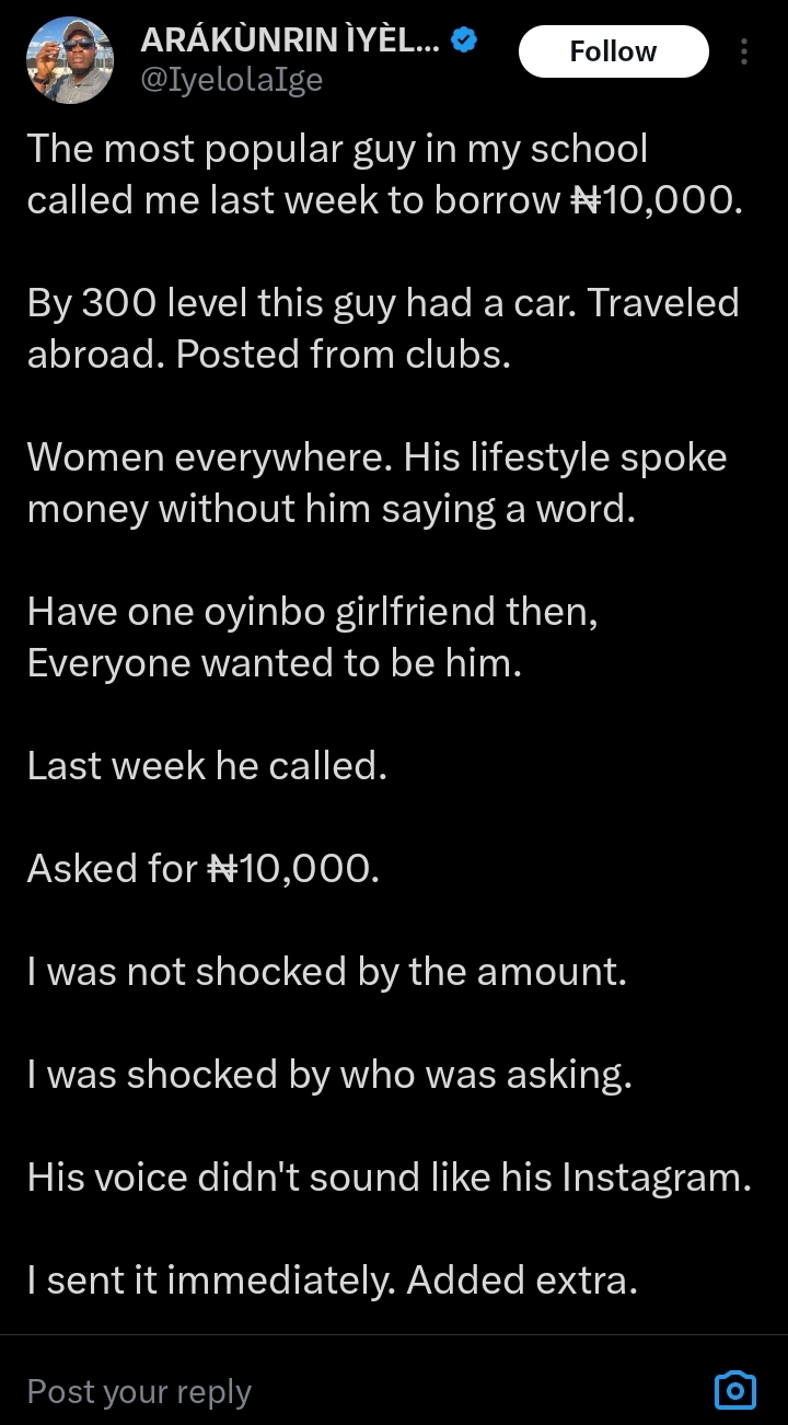 According to the X user, the request left him surprised, recalling that while in 300 level, the colleague had travelled abroad, owned a vehicle, and was well-known on campus.