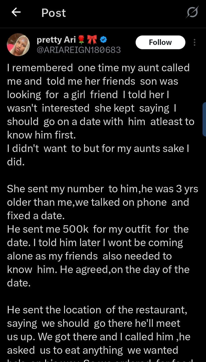 The lady, identified as @ARIAREIGN180683 on X (formerly Twitter), shared that she went on a date with the man at her aunt’s insistence.
