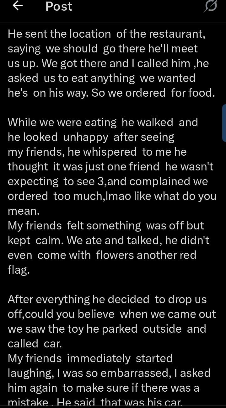 ”I told him later I wont be coming alone as my friends also needed to know him. He agreed,on the day of the date. He sent the location of the restaurant, saying we should go there he’ll meet us up”, The tweet reads in part.