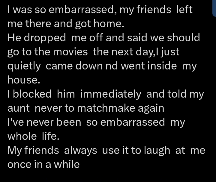 “He dropped me off and said we should go to the movies the next day,I just quietly came down and went inside my house.I blocked him immediately and told my aunt never to match make again”, She stated while recounting the incident.