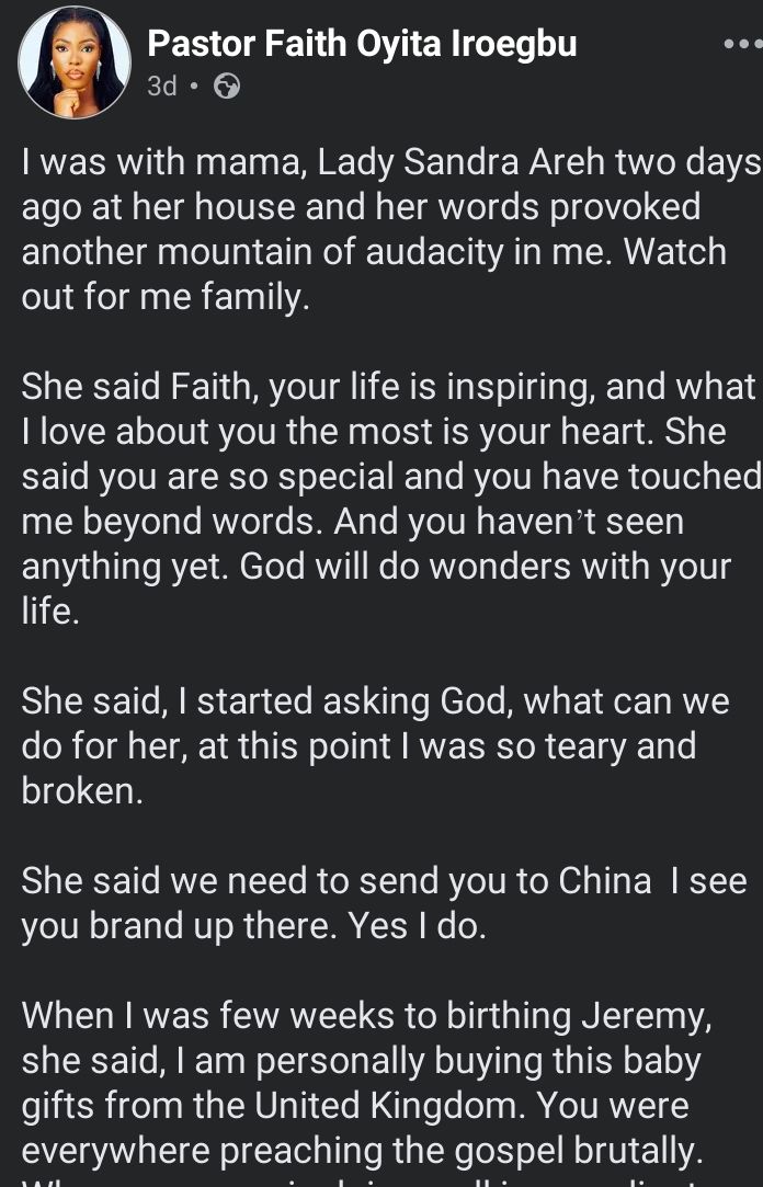 In her post, which has left social media buzzing, Faith Oyita recounted how Sandra Areh’s words resonated with her.