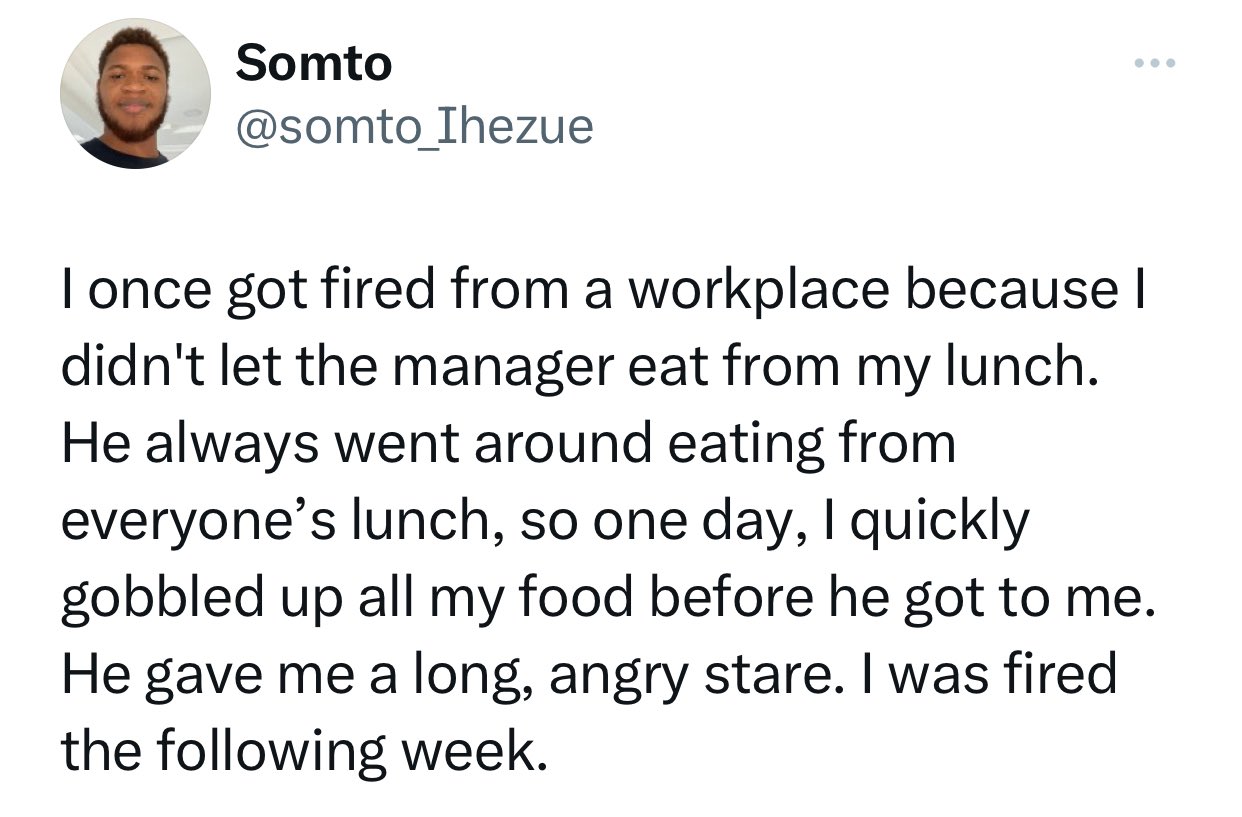 His statement: “I got fired from a workplace because I didn’t let the manager eat from my lunch. He always went around eating from everyone’s lunch, so one day, I quickly packed up all of my food before he got to me. He gave me a long, angry stare. I was fired the following week.”