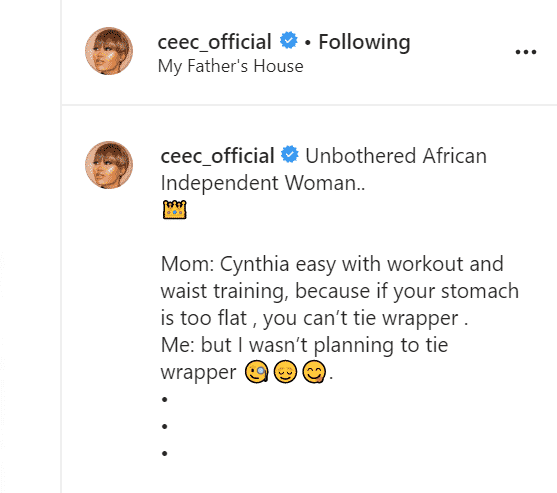 Big brother Naija season 2 first runner up, Cynthia Nwadiora popularly known as CeeC, has said she is an unbothered African woman.
