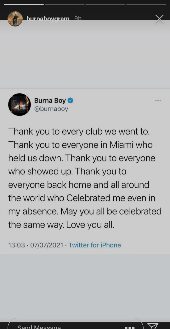Recall that Nigerian international artiste Burna Boy a few days ago clocked 30 and celebrated it in Miami.