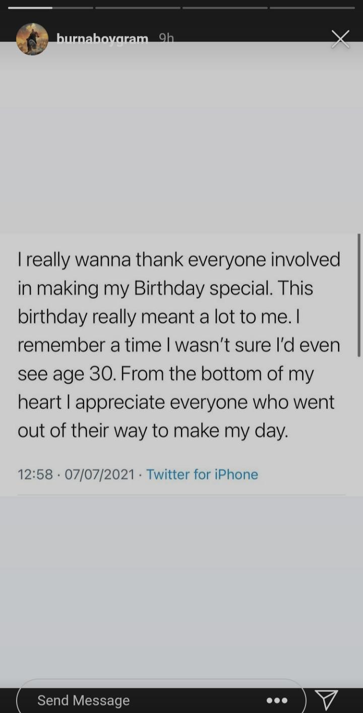 Well, Burna Boy, in his latest post via his social media timeline, has penned an appreciation message to everyone who celebrated his birthday with him.