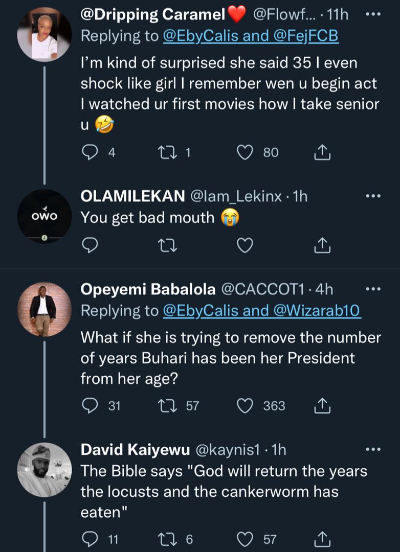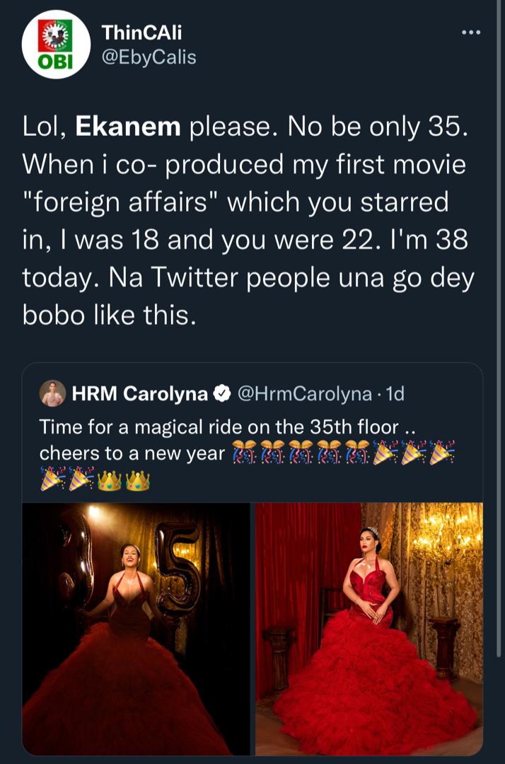 “Lol, Ekanem please. No be only 35. When i co- produced my first movie “foreign affairs” which you starred in, I was 18 and you were 22. I’m 38 today. Na Twitter people una go dey bobo like this,” the colleague wrote.