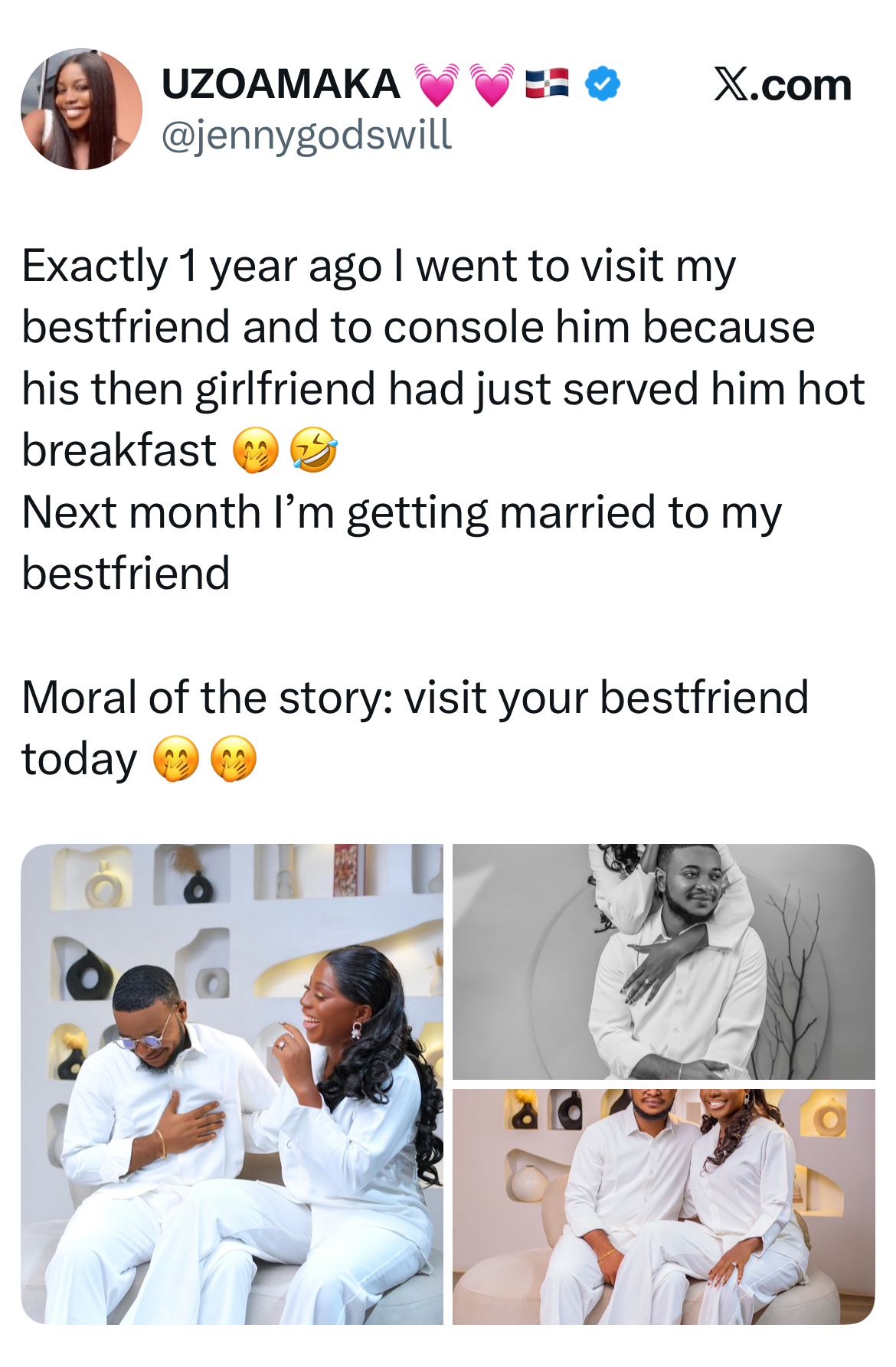 ”Exactly 1 year ago I went to visit my bestfriend and to console him because his then girlfriend had just served him hot breakfast 🤭🤣.Next month I’m getting married to my bestfriend“, The tweet reads.