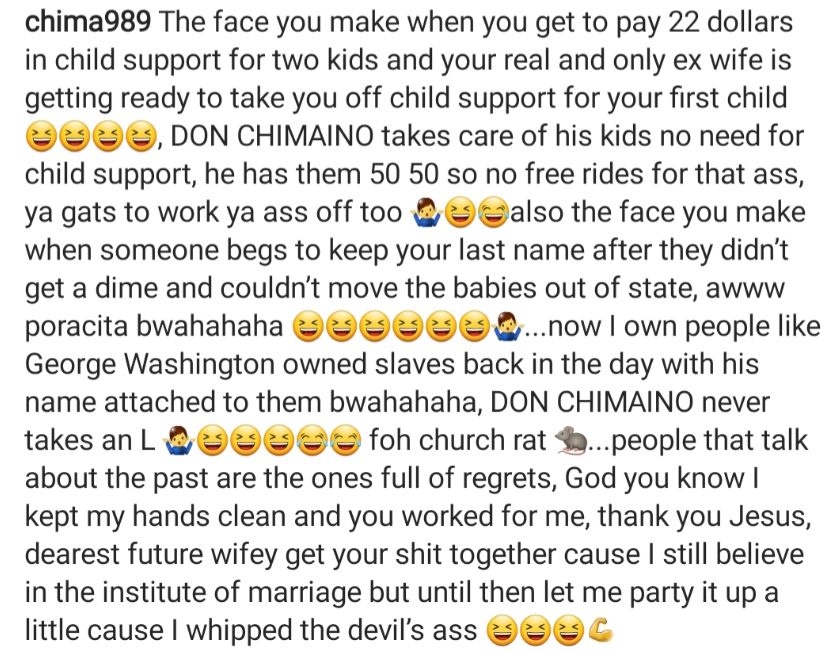 “The face you make when you get to pay 22 dollars in child support for two kids and your real and only ex wife is getting ready to take you off child support for your first child, DON CHIMAINO takes care of his kids no need for child support, he has them 50 50 so no free rides for that ass, ya gats to work ya ass off too also the face you make when someone begs to keep your last name after they didn’t get a dime and couldn’t move the babies out of state, awww poracita bwahahaha …now I own people like George Washington owned slaves back in the day with his name attached to them bwahahaha, DON CHIMAINO never takes an L . foh church rat …people that talk about the past are the ones full of regrets, God you know I kept my hands clean and you worked for me, thank you Jesus, dearest future wifey get your shit together cause I still believe in the institute of marriage but until then let me party it up a little cause I whipped the devil’s ass.”
