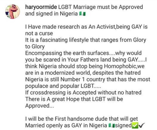 Openly-gay Nigerian man simply identified as Ayo has declared he will be the first Nigerian to get married openly as a gay man in Nigeria. Ayo stated this on his IG page in a post he made to demand a reversal of the law prohibiting gay marriages in Nigeria.