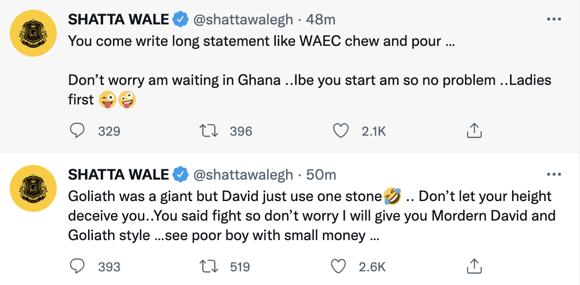 A lot of words have been said, and Shatta Wale is still on Burna Boy. Tweeting from his verified Twitter profile this morning, he wrote: