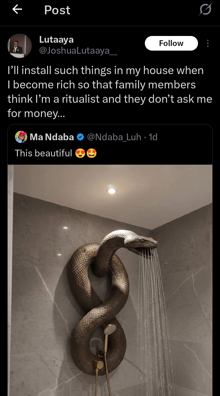 In a retweet, the man shared that he would install a python shower in his house upon getting rich.